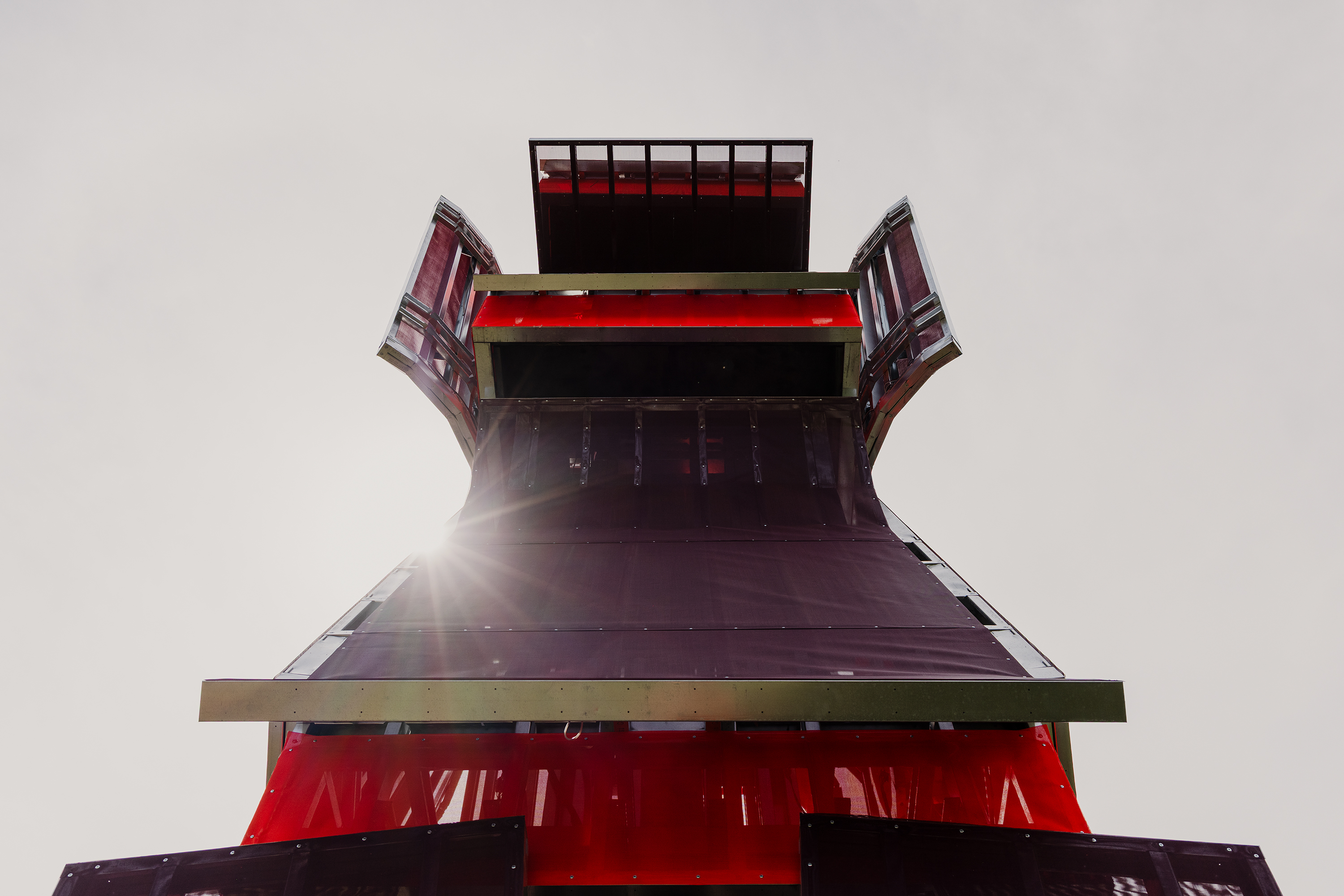 “Visage Brut” reimagines the logic and mythology of a totem pole through the language of contemporary construction. The tower is composed of modular boxes that are folded, rolled, cut or warped — just short of losing their structural integrity. See more photos of the project below.